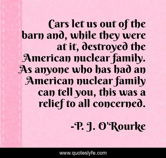This page presents the quote "Cars let us out of the barn and, while they were at it, destroyed the American nuclear family. As anyone who has had an American nuclear family can tell you, this was a relief to all concerned.". Author of this quote is P. J. O'Rourke. This quote is about american, family,.