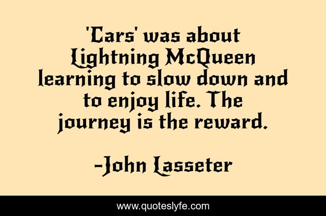 This page presents the quote "'Cars' was about Lightning McQueen learning to slow down and to enjoy life. The journey is the reward.". Author of this quote is John Lasseter. This quote is about life, journey, enjoy life,.