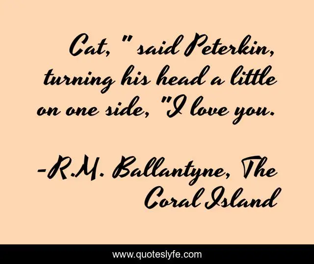 This page presents the quote "Cat, " said Peterkin, turning his head a little on one side, "I love you.". Author of this quote is R.M. Ballantyne, The Coral Island. This quote is about the-coral-island, adventure, ballantyne,.
