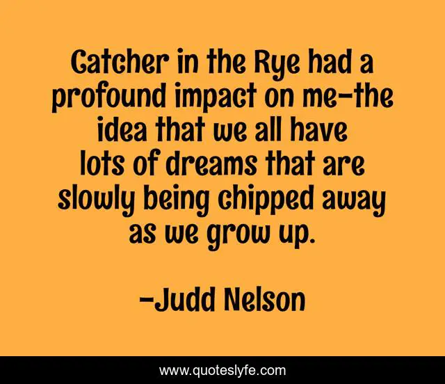 This page presents the quote "Catcher in the Rye had a profound impact on me-the idea that we all have lots of dreams that are slowly being chipped away as we grow up.". Author of this quote is Judd Nelson. This quote is about impact, grow, profound,.