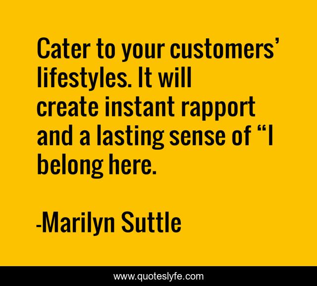 This page presents the quote "Cater to your customers’ lifestyles. It will create instant rapport and a lasting sense of “I belong here.". Author of this quote is Marilyn Suttle. This quote is about business, customer-service,.