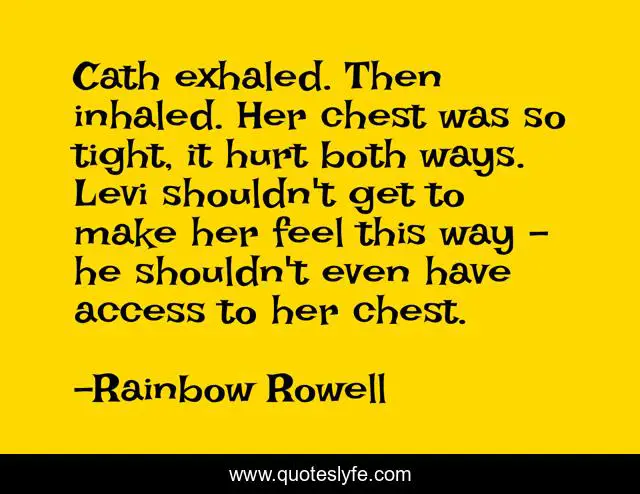 This page presents the quote "Cath exhaled. Then inhaled. Her chest was so tight, it hurt both ways. Levi shouldn't get to make her feel this way - he shouldn't even have access to her chest.". Author of this quote is Rainbow Rowell. This quote is about fanfiction, cath, wren, reagan, snow, romance, levi, young-adult-fiction, fangirl,.