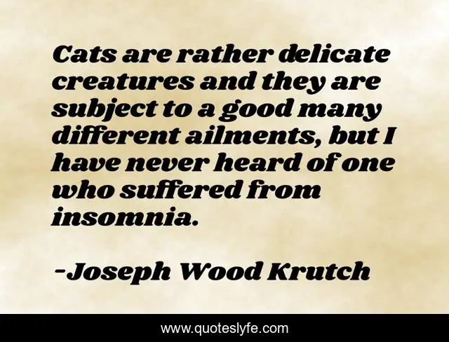 This page presents the quote "Cats are rather delicate creatures and they are subject to a good many different ailments, but I have never heard of one who suffered from insomnia.". Author of this quote is Joseph Wood Krutch. This quote is about good, cats,.