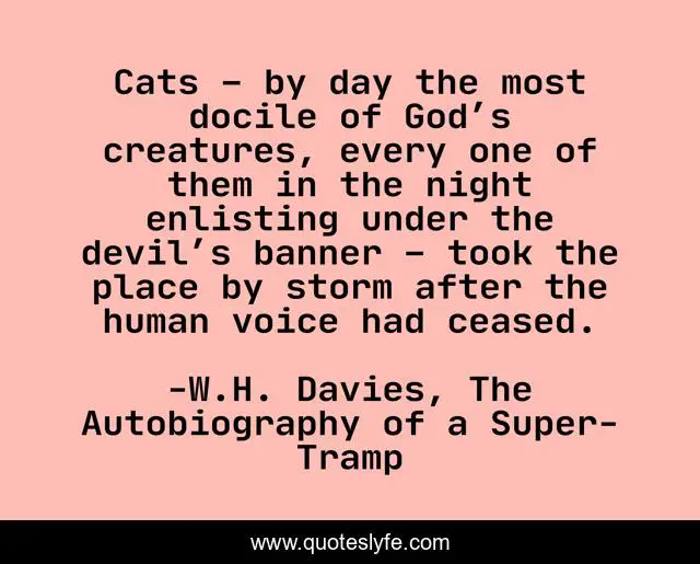 "W.H. Davies, The Autobiography of a Super-Tramp Quotes." Quoteslyfe.com, 2025. Fri. 05 Dec. 2025. <https://www.quoteslyfe.com/quote/Cats-by-day-the-most-docile-of-222710>.