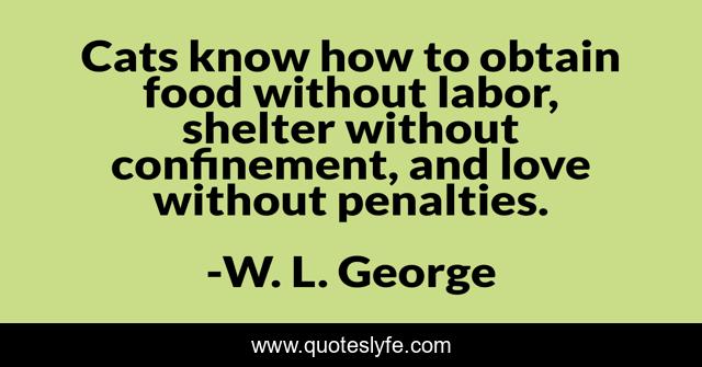 This page presents the quote "Cats know how to obtain food without labor, shelter without confinement, and love without penalties.". Author of this quote is W. L. George. This quote is about pet, cats, love, affection,.