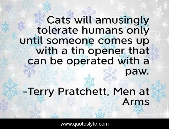 This page presents the quote "Cats will amusingly tolerate humans only until someone comes up with a tin opener that can be operated with a paw.". Author of this quote is Terry Pratchett, Men at Arms. .