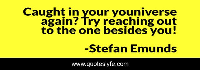 This page presents the quote "Caught in your youniverse again? Try reaching out to the one besides you!". Author of this quote is Stefan Emunds. This quote is about confidence, psychology, communication, loneliness, motivational, reaching-out, optimistic, inspirational, isolation,.
