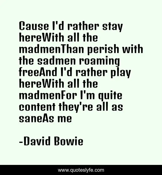 This page presents the quote "Cause I'd rather stay hereWith all the madmenThan perish with the sadmen roaming freeAnd I'd rather play hereWith all the madmenFor I'm quite content they're all as saneAs me". Author of this quote is David Bowie. .