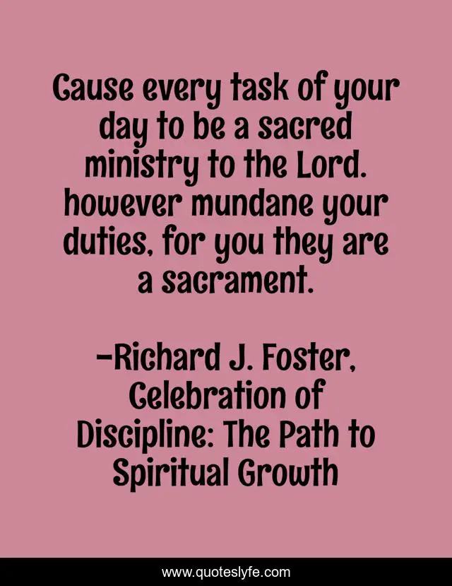 This page presents the quote "Cause every task of your day to be a sacred ministry to the Lord. however mundane your duties, for you they are a sacrament.". Author of this quote is Richard J. Foster, Celebration of Discipline: The Path to Spiritual Growth. This quote is about discipleship, ministry, evangelism, calling, job, vocation, worship,.