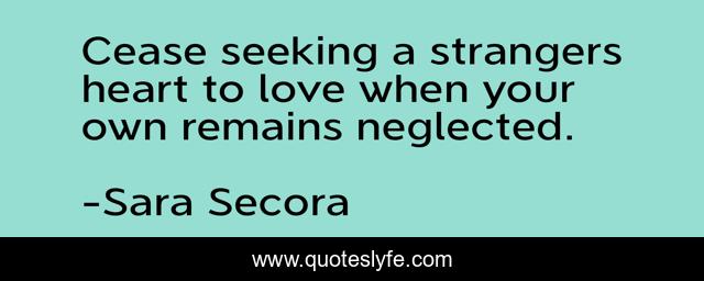 This page presents the quote "Cease seeking a strangers heart to love when your own remains neglected.". Author of this quote is Sara Secora. This quote is about relationships, heart, love, breakup, quotes, affection,.