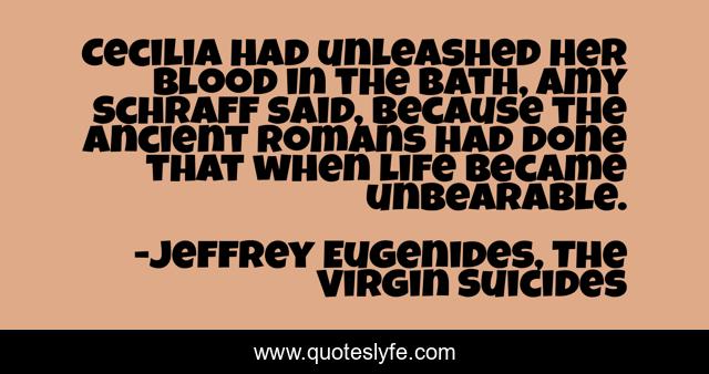 This page presents the quote "Cecilia had unleashed her blood in the bath, Amy Schraff said, because the ancient Romans had done that when life became unbearable.". Author of this quote is Jeffrey Eugenides, The Virgin Suicides. This quote is about jeffrey-eugenides, blood, the-virgin-suicides,.
