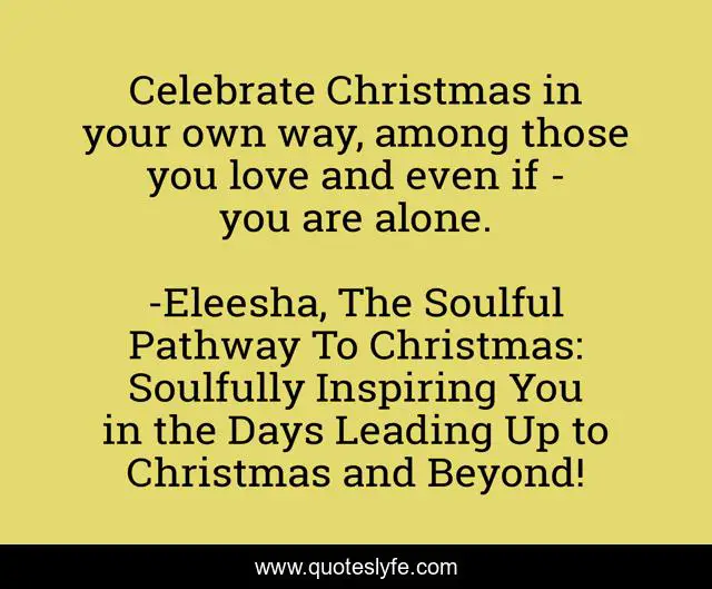 This page presents the quote "Celebrate Christmas in your own way, among those you love and even if - you are alone.". Author of this quote is Eleesha, The Soulful Pathway To Christmas: Soulfully Inspiring You in the Days Leading Up to Christmas and Beyond!. This quote is about christmas-spirit, positive, motivational, empowerment, soul, quotes, channeling, inspirational, affirmations,.