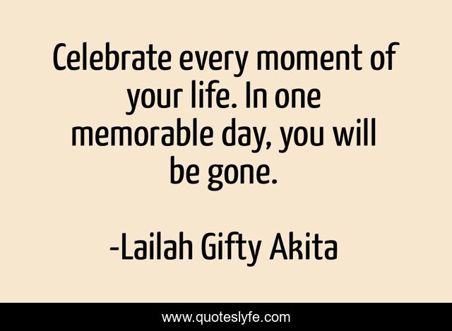 This page presents the quote "Celebrate every moment of your life. In one memorable day, you will be gone.". Author of this quote is Lailah Gifty Akita. This quote is about life, positive, motivational, confidence, wisdom-of-lailah-gifty-akita, optimistic, celebrate,.