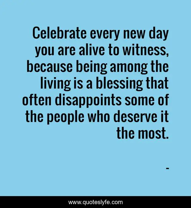 This page presents the quote "Celebrate every new day you are alive to witness, because being among the living is a blessing that often disappoints some of the people who deserve it the most.". Author of this quote is . This quote is about being-among-the-living, celebrate-each-day, be-thankful-to-be-alive, edmond-mbiaka, be-happy-to-be-alive,.