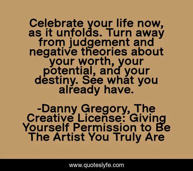 This page presents the quote "Celebrate your life now, as it unfolds. Turn away from judgement and negative theories about your worth, your potential, and your destiny. See what you already have.". Author of this quote is Danny Gregory, The Creative License: Giving Yourself Permission to Be The Artist You Truly Are. This quote is about life, art, permission, creativity, motivation, inspiration,.