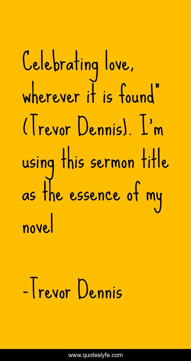 This page presents the quote "Celebrating love, wherever it is found" (Trevor Dennis). I'm using this sermon title as the essence of my novel". Author of this quote is Trevor Dennis. This quote is about love, acceptance, tolerance, affection, affirmation,.
