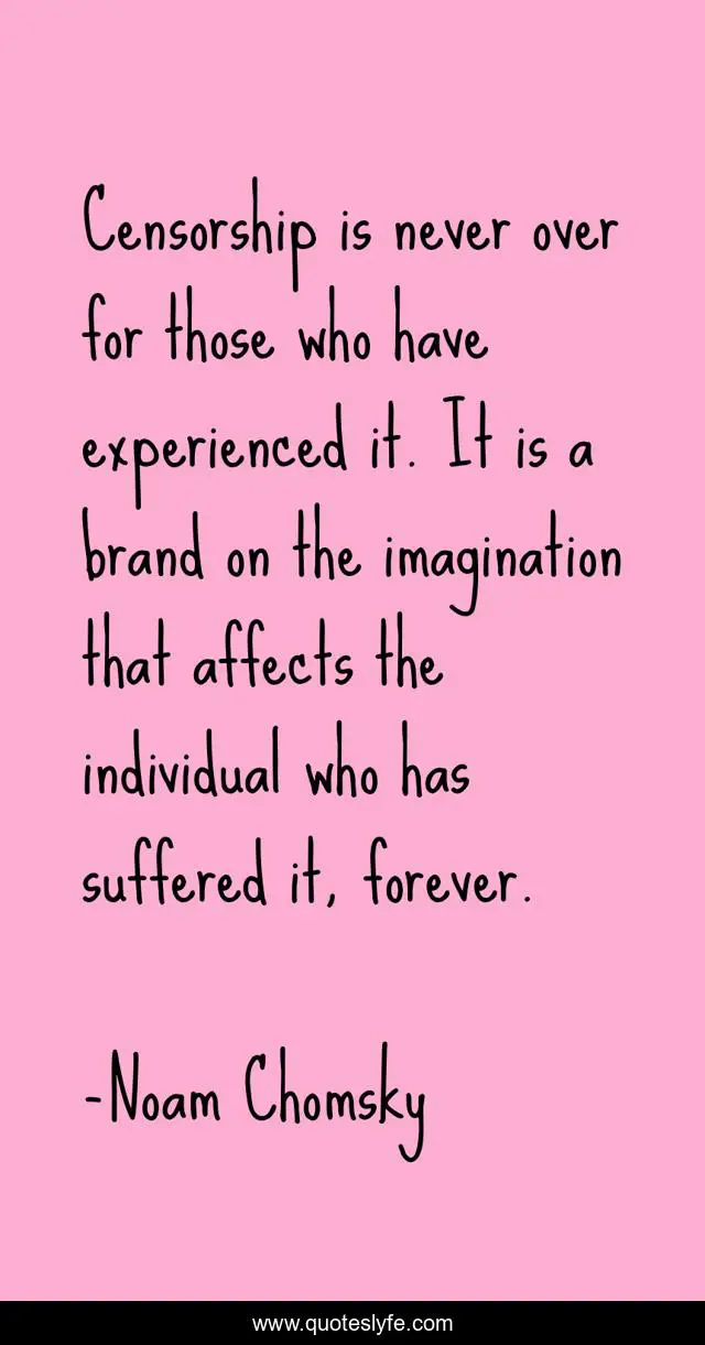 This page presents the quote "Censorship is never over for those who have experienced it. It is a brand on the imagination that affects the individual who has suffered it, forever.". Author of this quote is Noam Chomsky. This quote is about brand, forever, censorship,.