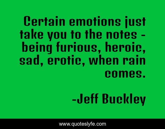 This page presents the quote "Certain emotions just take you to the notes - being furious, heroic, sad, erotic, when rain comes.". Author of this quote is Jeff Buckley. This quote is about rain, emotions,.