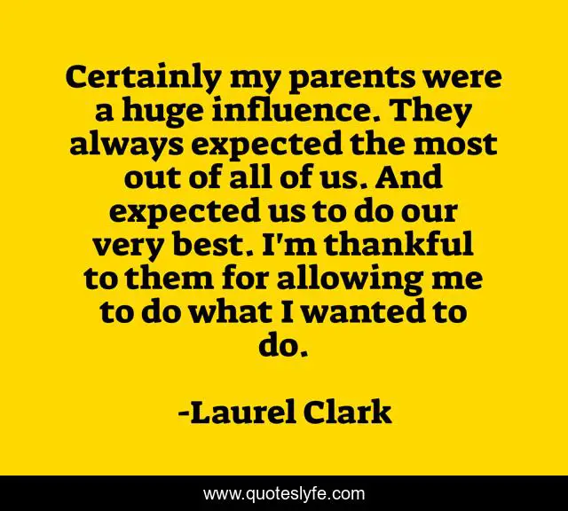 This page presents the quote "Certainly my parents were a huge influence. They always expected the most out of all of us. And expected us to do our very best. I'm thankful to them for allowing me to do what I wanted to do.". Author of this quote is Laurel Clark. This quote is about parents, influence, best,.