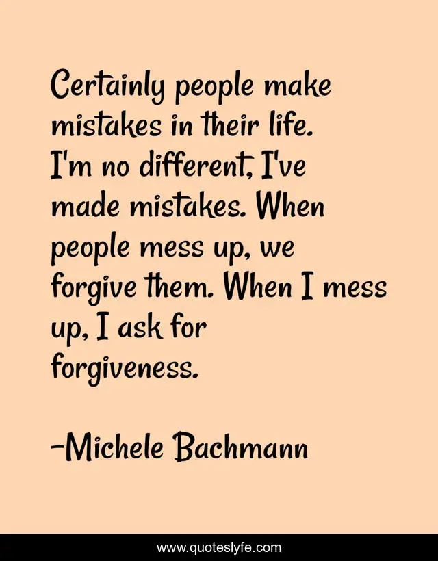 This page presents the quote "Certainly people make mistakes in their life. I'm no different, I've made mistakes. When people mess up, we forgive them. When I mess up, I ask for forgiveness.". Author of this quote is Michele Bachmann. This quote is about life, mistakes, people,.