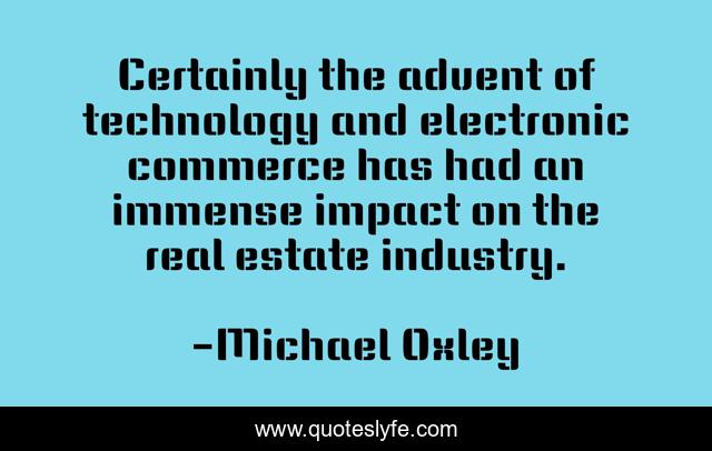 This page presents the quote "Certainly the advent of technology and electronic commerce has had an immense impact on the real estate industry.". Author of this quote is Michael Oxley. This quote is about impact, real, real estate,.