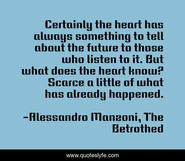 This page presents the quote "Certainly the heart has always something to tell about the future to those who listen to it. But what does the heart know? Scarce a little of what has already happened.". Author of this quote is Alessandro Manzoni, The Betrothed. This quote is about past, heart, future,.