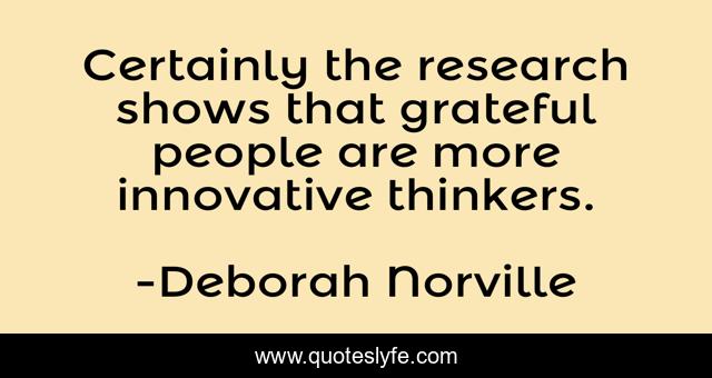This page presents the quote "Certainly the research shows that grateful people are more innovative thinkers.". Author of this quote is Deborah Norville. This quote is about research, grateful, people,.