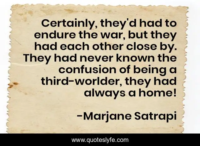 This page presents the quote "Certainly, they'd had to endure the war, but they had each other close by. They had never known the confusion of being a third-worlder, they had always a home!". Author of this quote is Marjane Satrapi. This quote is about p267, iran, immigrants, experience, austria, war,.