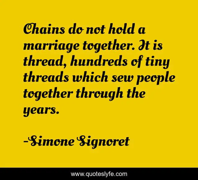 This page presents the quote "Chains do not hold a marriage together. It is thread, hundreds of tiny threads which sew people together through the years.". Author of this quote is Simone Signoret. This quote is about love, bonds, possessiveness, marriage, chains, affection,.