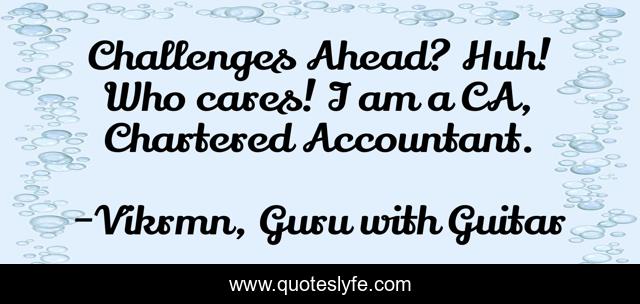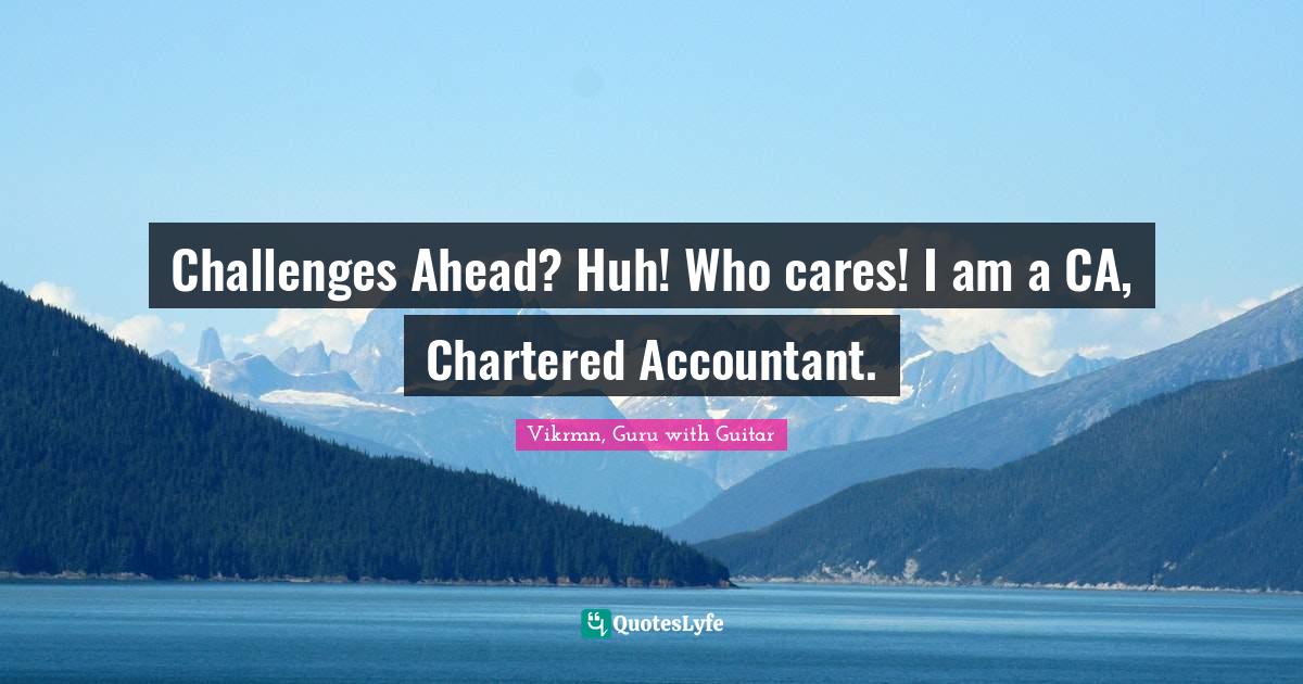 This page presents the quote "Challenges Ahead? Huh! Who cares! I am a CA, Chartered Accountant.". Author of this quote is Vikrmn, Guru with Guitar. This quote is about gwg, vikram, positive, motivational, confidence, ca-vikram-verma, guru-with-guitar, challenges, vikrmn,.