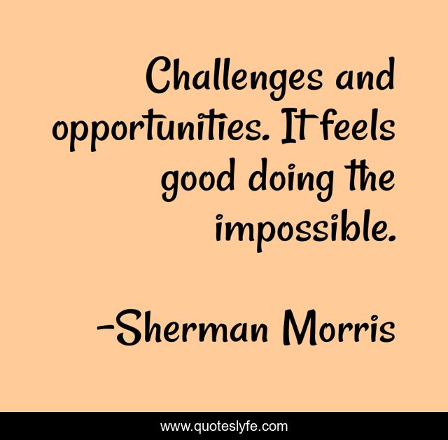 This page presents the quote "Challenges and opportunities. It feels good doing the impossible.". Author of this quote is Sherman Morris. This quote is about challenges, opportunities,.
