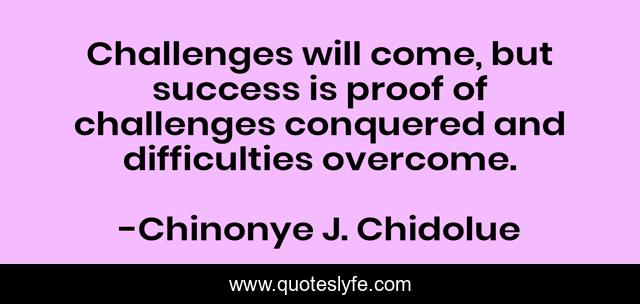 "Chinonye J. Chidolue Quotes." Quoteslyfe.com, 2025. Sat. 06 Dec. 2025. <https://www.quoteslyfe.com/quote/Challenges-will-come-but-success-is-proof-83551>.