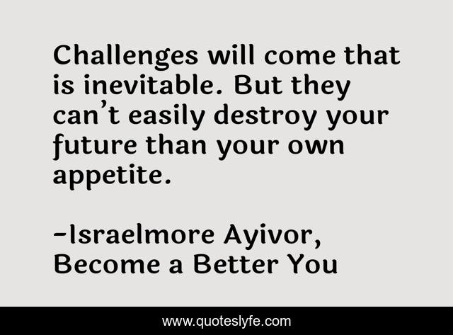 This page presents the quote "Challenges will come that is inevitable. But they can’t easily destroy your future than your own appetite.". Author of this quote is Israelmore Ayivor, Become a Better You. This quote is about enjoy, inspirations, challenges, optimistic, appetite, food-for-thought, positive, israelmore-ayivor, limitations,.