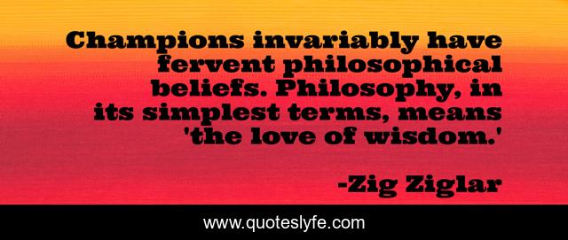 This page presents the quote "Champions invariably have fervent philosophical beliefs. Philosophy, in its simplest terms, means 'the love of wisdom.'". Author of this quote is Zig Ziglar. This quote is about philosophy, love, champions, affection,.