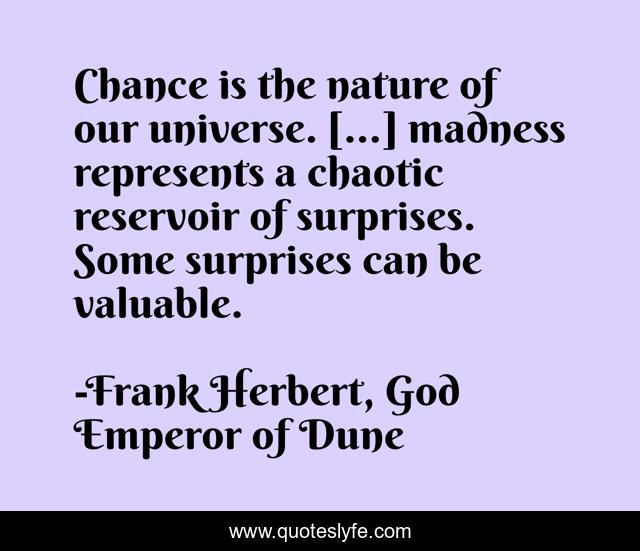 This page presents the quote "Chance is the nature of our universe. […] madness represents a chaotic reservoir of surprises. Some surprises can be valuable.". Author of this quote is Frank Herbert, God Emperor of Dune. This quote is about surprise, chance, chaos,.