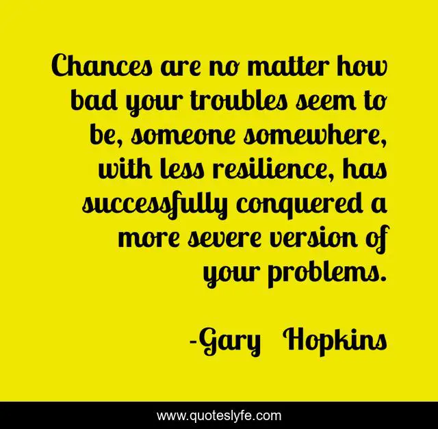 This page presents the quote "Chances are no matter how bad your troubles seem to be, someone somewhere, with less resilience, has successfully conquered a more severe version of your problems.". Author of this quote is Gary Hopkins. This quote is about empowerment, strength, big-picture, strength-through-adversity, fearless, courageous, resilience, fortitude, self-reliance,.