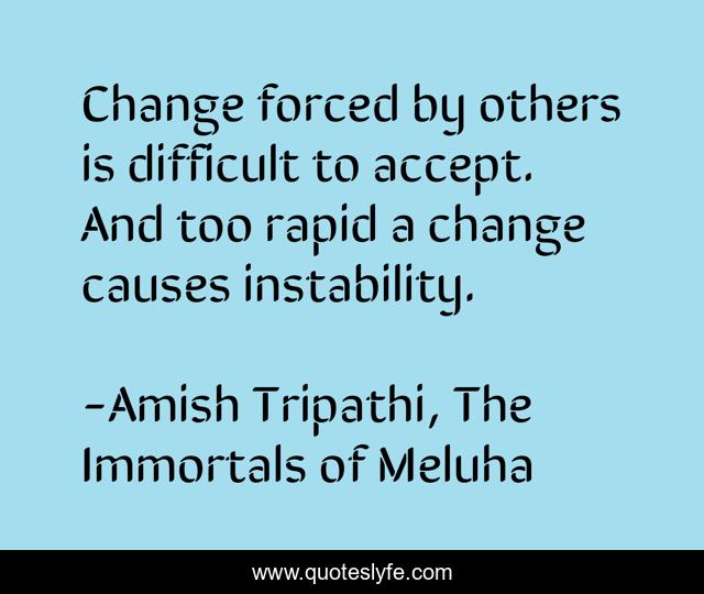 This page presents the quote "Change forced by others is difficult to accept. And too rapid a change causes instability.". Author of this quote is Amish Tripathi, The Immortals of Meluha. .