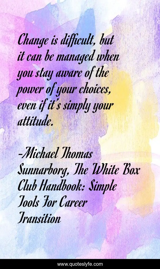 This page presents the quote "Change is difficult, but it can be managed when you stay aware of the power of your choices, even if it’s simply your attitude.". Author of this quote is Michael Thomas Sunnarborg, The White Box Club Handbook: Simple Tools For Career Transition. This quote is about challenge, layoffs, change, transition,.