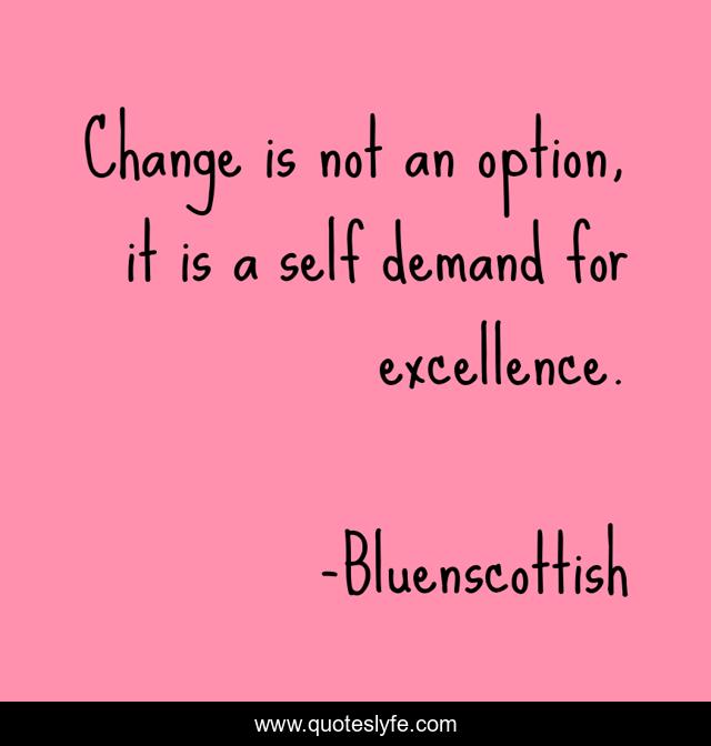 This page presents the quote "Change is not an option, it is a self demand for excellence.". Author of this quote is Bluenscottish. This quote is about bluenscottish, excellence, change,.