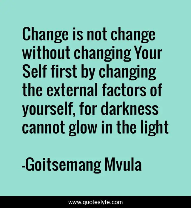 This page presents the quote "Change is not change without changing Your Self first by changing the external factors of yourself, for darkness cannot glow in the light". Author of this quote is Goitsemang Mvula. This quote is about light, self, change, darkness-of-light,.