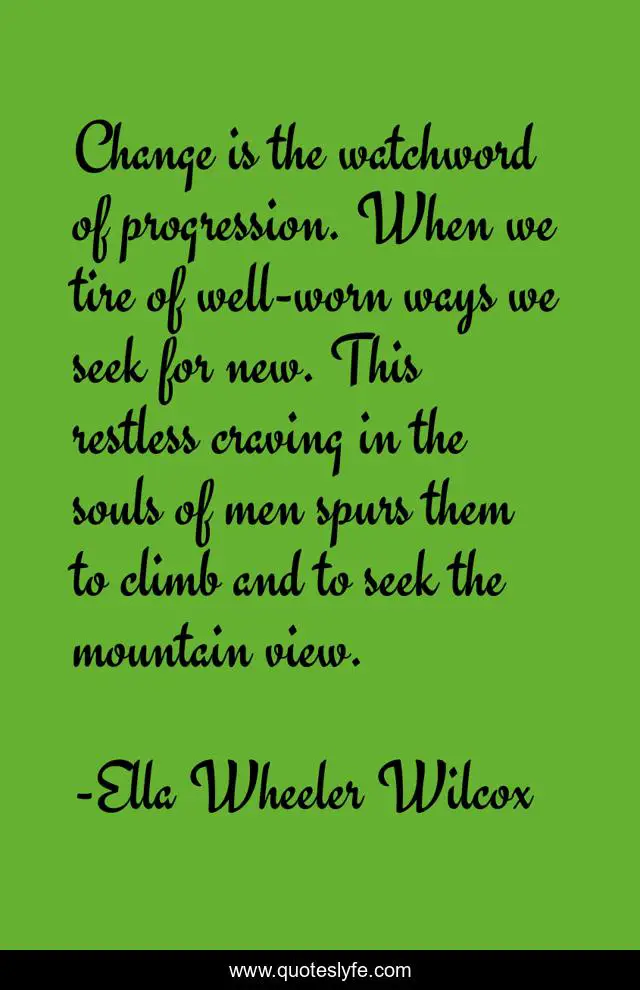 This page presents the quote "Change is the watchword of progression. When we tire of well-worn ways we seek for new. This restless craving in the souls of men spurs them to climb and to seek the mountain view.". Author of this quote is Ella Wheeler Wilcox. .