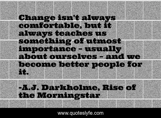 This page presents the quote "Change isn't always comfortable, but it always teaches us something of utmost importance – usually about ourselves – and we become better people for it.". Author of this quote is A.J. Darkholme, Rise of the Morningstar. This quote is about self-awareness, personal-growth, importance, comfort, comfortable, important, teaching, change,.
