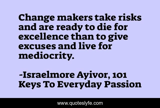 This page presents the quote "Change makers take risks and are ready to die for excellence than to give excuses and live for mediocrity.". Author of this quote is Israelmore Ayivor, 101 Keys To Everyday Passion. This quote is about make-a-change, food-for-thought, change-maker, risk, die, excel, israelmore-ayivor, excuses, live,.