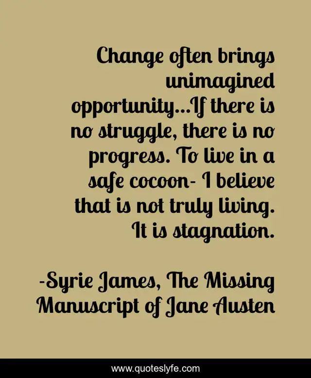 "Syrie James, The Missing Manuscript of Jane Austen Quotes." Quoteslyfe.com, 2025. Mon. 08 Dec. 2025. <https://www.quoteslyfe.com/quote/Change-often-brings-unimagined-opportunity-If-there-210145>.