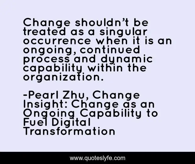 This page presents the quote "Change shouldn’t be treated as a singular occurrence when it is an ongoing, continued process and dynamic capability within the organization.". Author of this quote is Pearl Zhu, Change Insight: Change as an Ongoing Capability to Fuel Digital Transformation. This quote is about insight, change-management,.