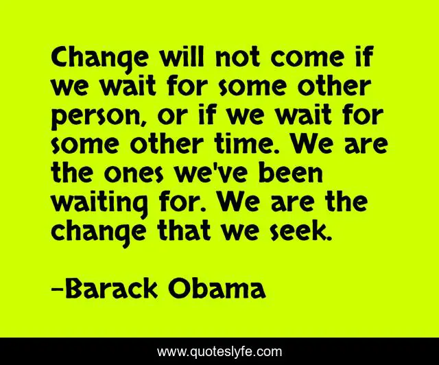 "Barack Obama Quotes." Quoteslyfe.com, 2025. Sun. 07 Dec. 2025. <https://www.quoteslyfe.com/quote/Change-will-not-come-if-we-wait-3806>.