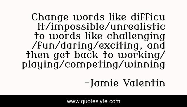 This page presents the quote "Change words like difficult/impossible/unrealistic to words like challenging/fun/daring/exciting, and then get back to working/playing/competing/winning". Author of this quote is Jamie Valentin. This quote is about faith, direction, plans, success, accomplishment, behaviour, attitude, accomplishments, hope,.