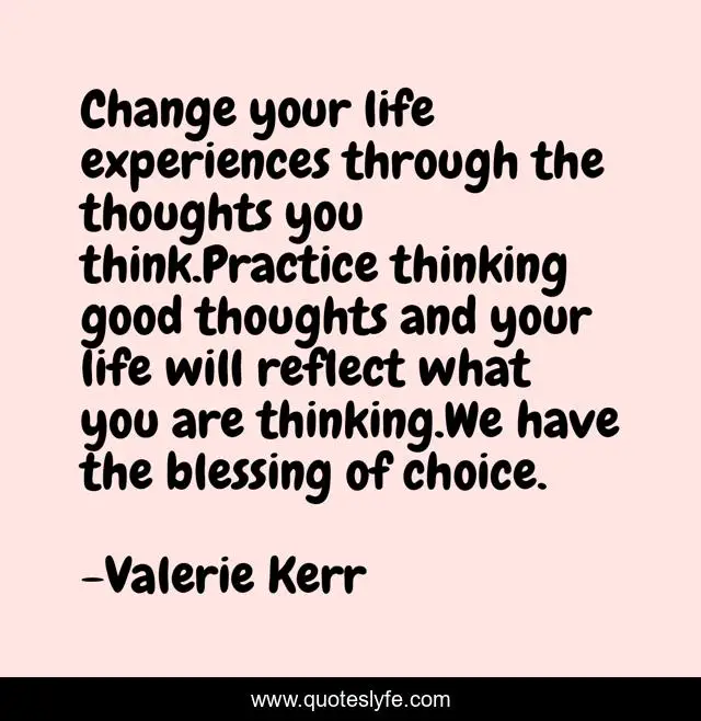 This page presents the quote "Change your life experiences through the thoughts you think.Practice thinking good thoughts and your life will reflect what you are thinking.We have the blessing of choice.". Author of this quote is Valerie Kerr. This quote is about lessons, clouds, piano, white-lion, first,.