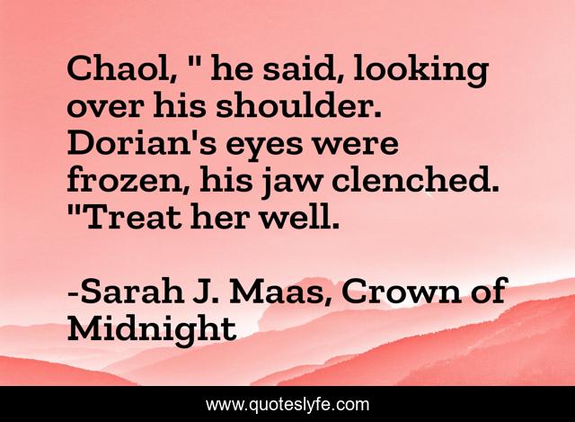 This page presents the quote "Chaol, " he said, looking over his shoulder. Dorian's eyes were frozen, his jaw clenched. "Treat her well.". Author of this quote is Sarah J. Maas, Crown of Midnight. This quote is about love, ya, celaena, ya-fiction, price, fantasy, chaol, crown-of-midnight, dorian,.