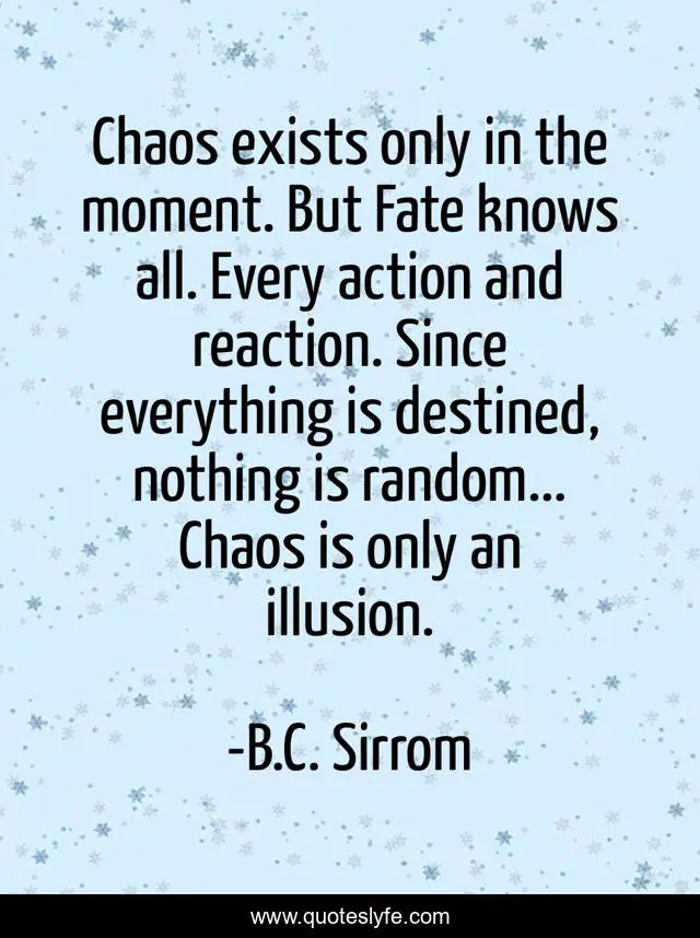 This page presents the quote "Chaos exists only in the moment. But Fate knows all. Every action and reaction. Since everything is destined, nothing is random... Chaos is only an illusion.". Author of this quote is B.C. Sirrom. This quote is about supernatural, paranormal-romance, fate, vampire,.